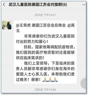 - 2月13日当王荣虎博士获知这个德国公司无法按时出货和他们对口罩技术不熟悉时,为了保护同胞利益,他连夜联系德国华人抗疫采购群的群主梁女士,请她在群里发出警告: