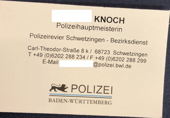 - 2月25日,我们和供货方据理力争,无果后去警察局报警投诉这家德国公司和其主管,下午又去找供货方,以下是报警记录的警察名片。目前我们的刑事报案在曼海姆检察局第五部门调查中。