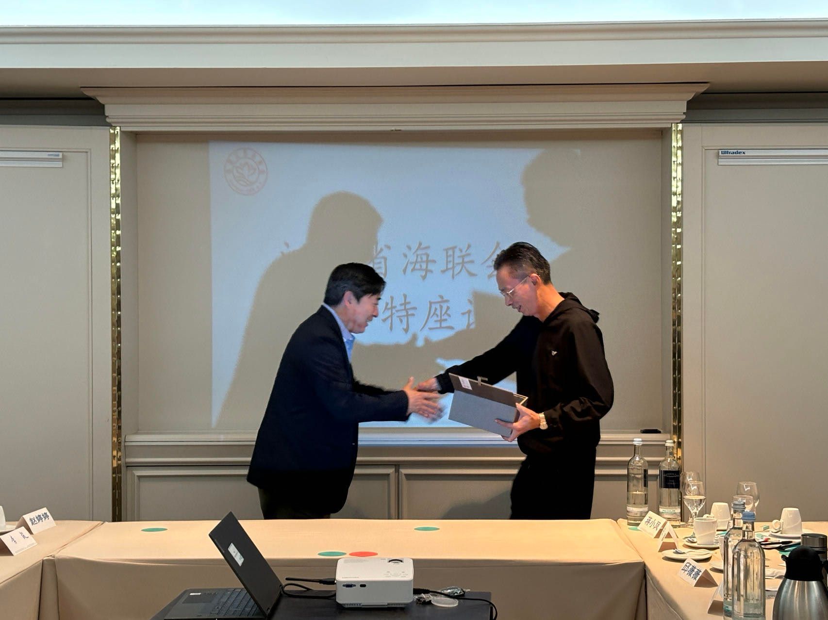 照片三:省友协钱文华副会长(右)向德国汉园中文学校王杰校长赠送礼品